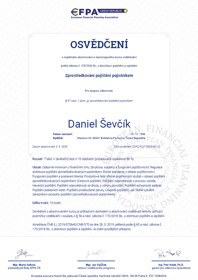 Neživotní pojištění chrání to, co jste již vybudovali. Společně nastavíme ochranu domu, auta, firmy, odpovědnosti tak, aby vaše hodnoty byly v bezpečí. Zajistím, že pojištění bude odpovídat vašim potřebám i rozumné ceně.